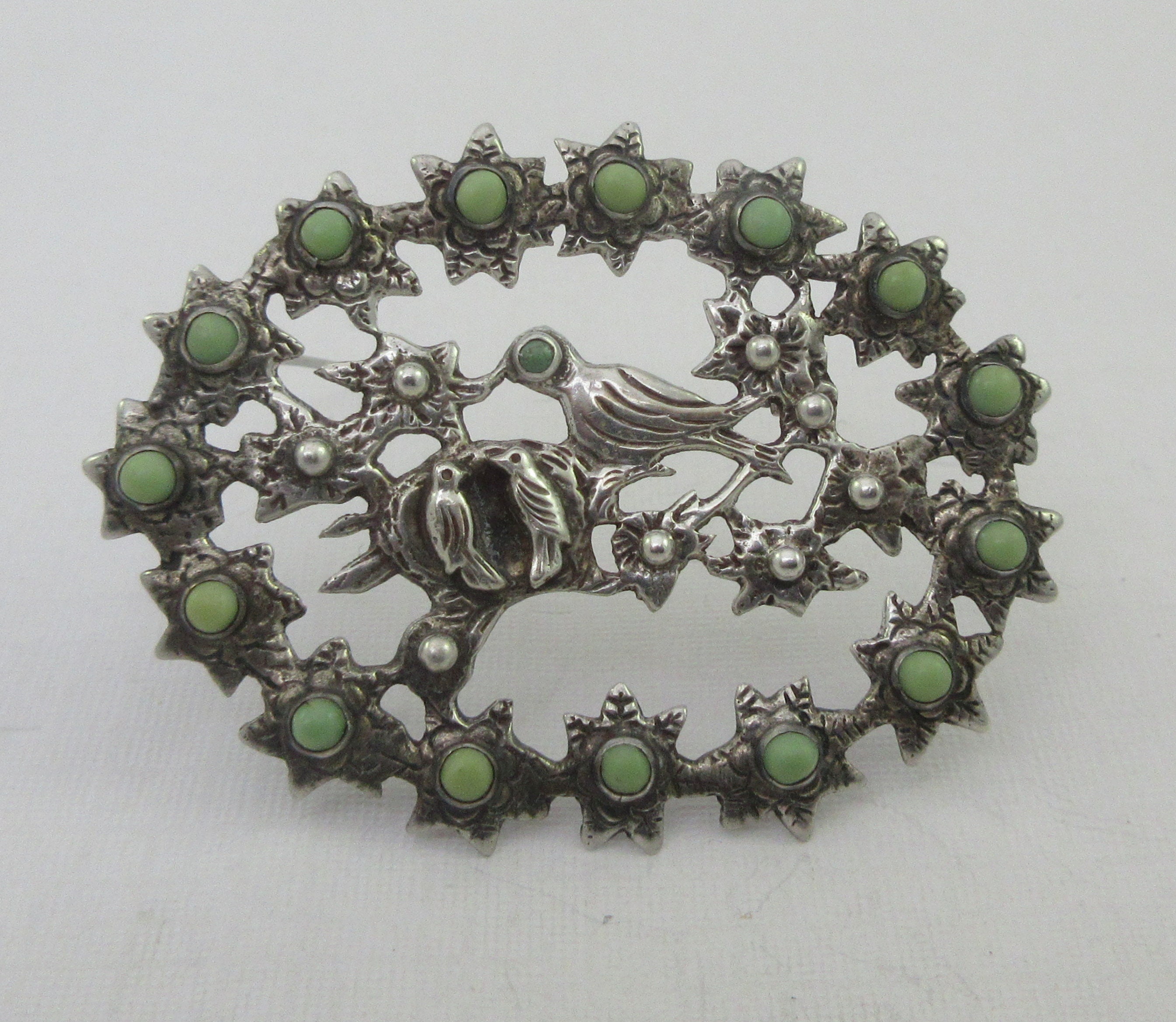 Large Sterling Silver Floral Bird Nest Green Stone Brooch Etsy